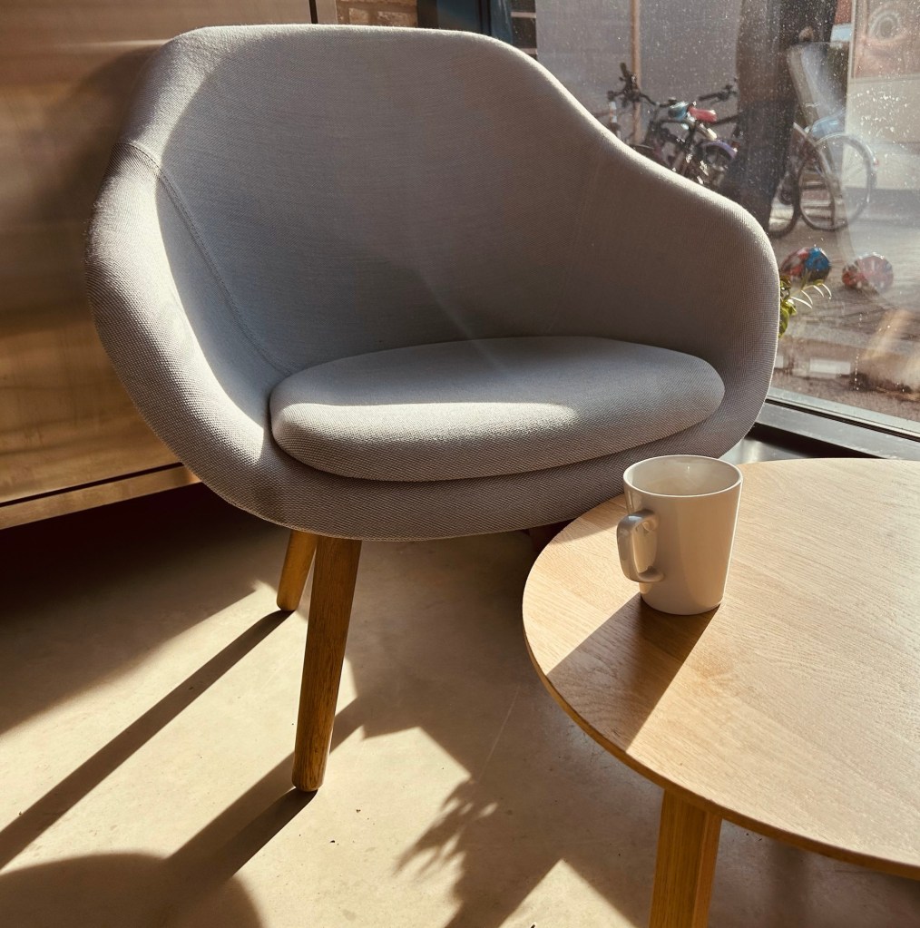 Sunshine and tea in the foyer of a church on Sunday morning.